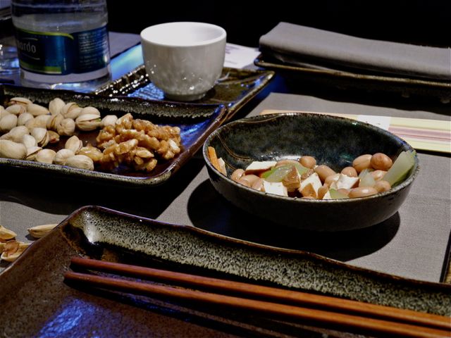 Al tavolo abbiamo trovato frutta secca (le noci al miele erano buonissime) e un’insalatina di legumi e tofu. Il primo tè è stato il Anji Bai Cha, un tè verde molto chiaro, dal sapore delicato e persistente.