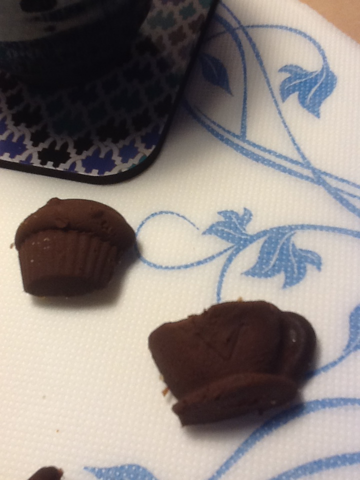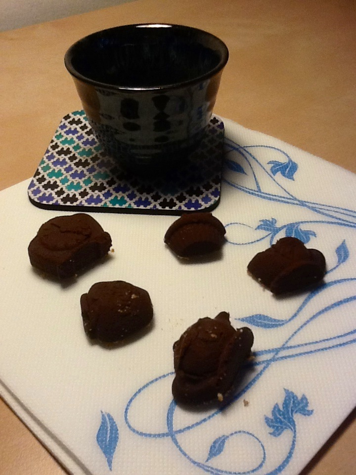 Versate il cioccolato negli stampini cercando di coprire uniformemente la superficie con l’aiuto di un cucchiaino. Sbriciolate un biscotto e cospargetelo sopra i cioccolatini.