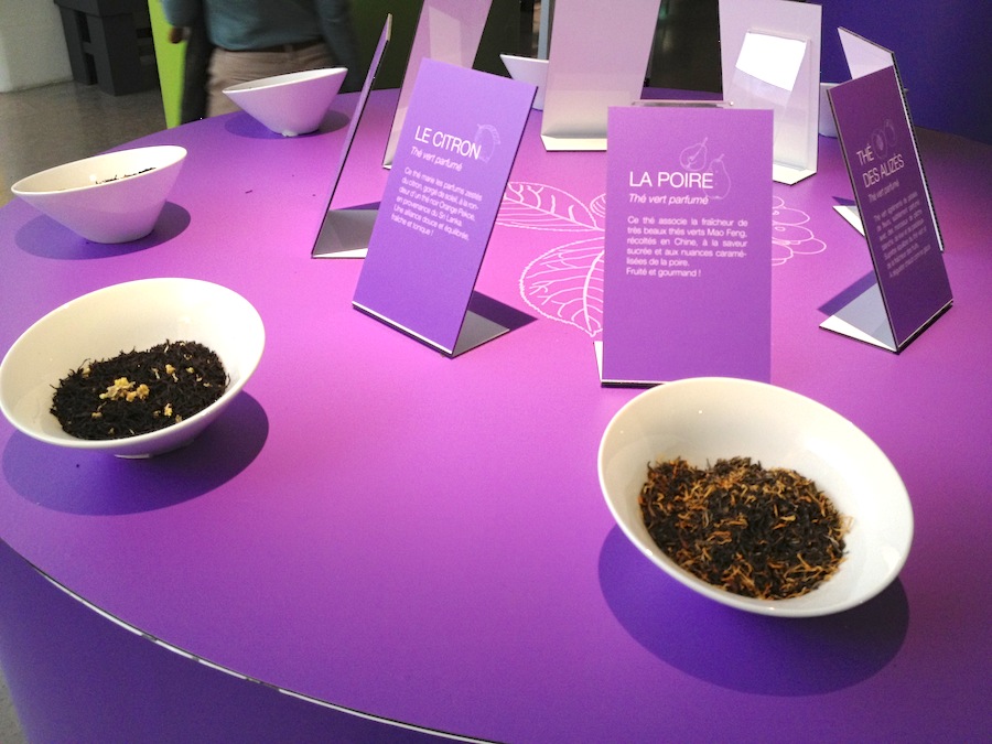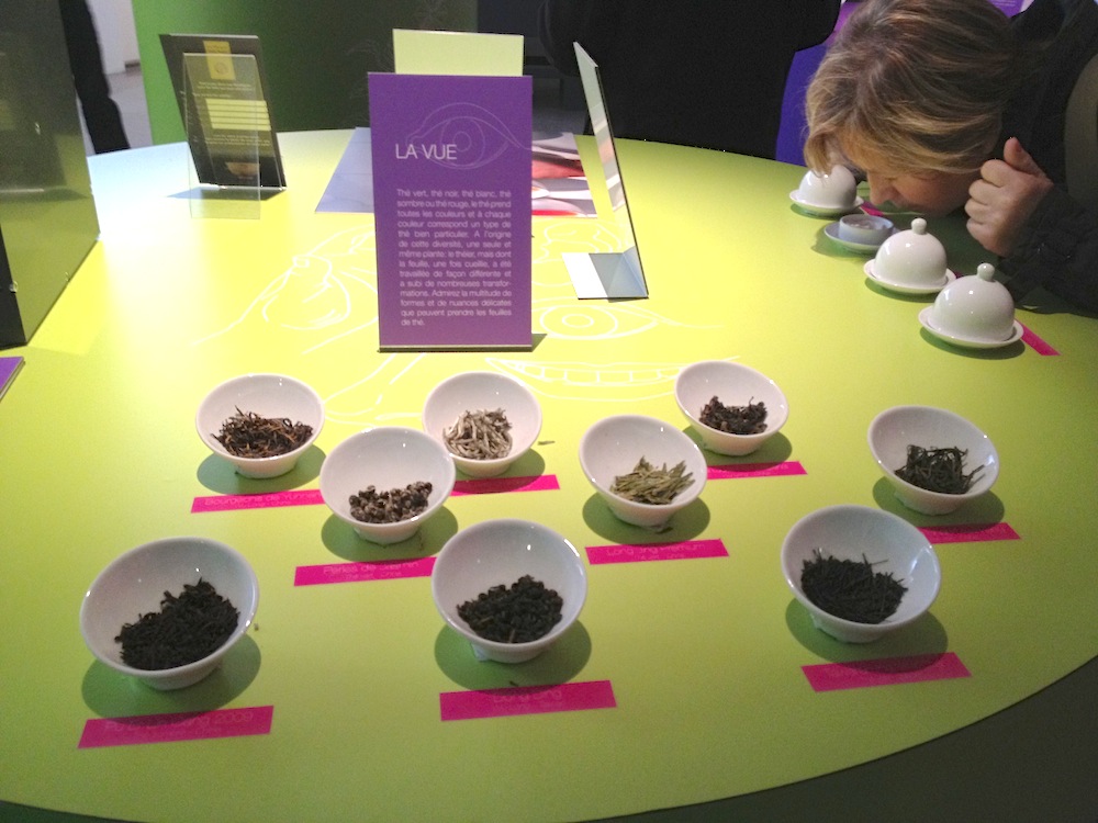Il percorso espositivo è anticipato da una lunga teca in cui sono illustrati i “fondamenti” del tè: i Paesi che lo coltivano, le diverse qualità e le tecniche di produzione. Il protagonista assoluto della mostra trova invece posto in alcune bacinelle sistemate su dei tavolini: i visitatori possono avvicinarsi e sentire il profumo di numerose qualità, informandosi sulle caratteristiche leggendo le rispettive didascalie (purtroppo solo in francese).