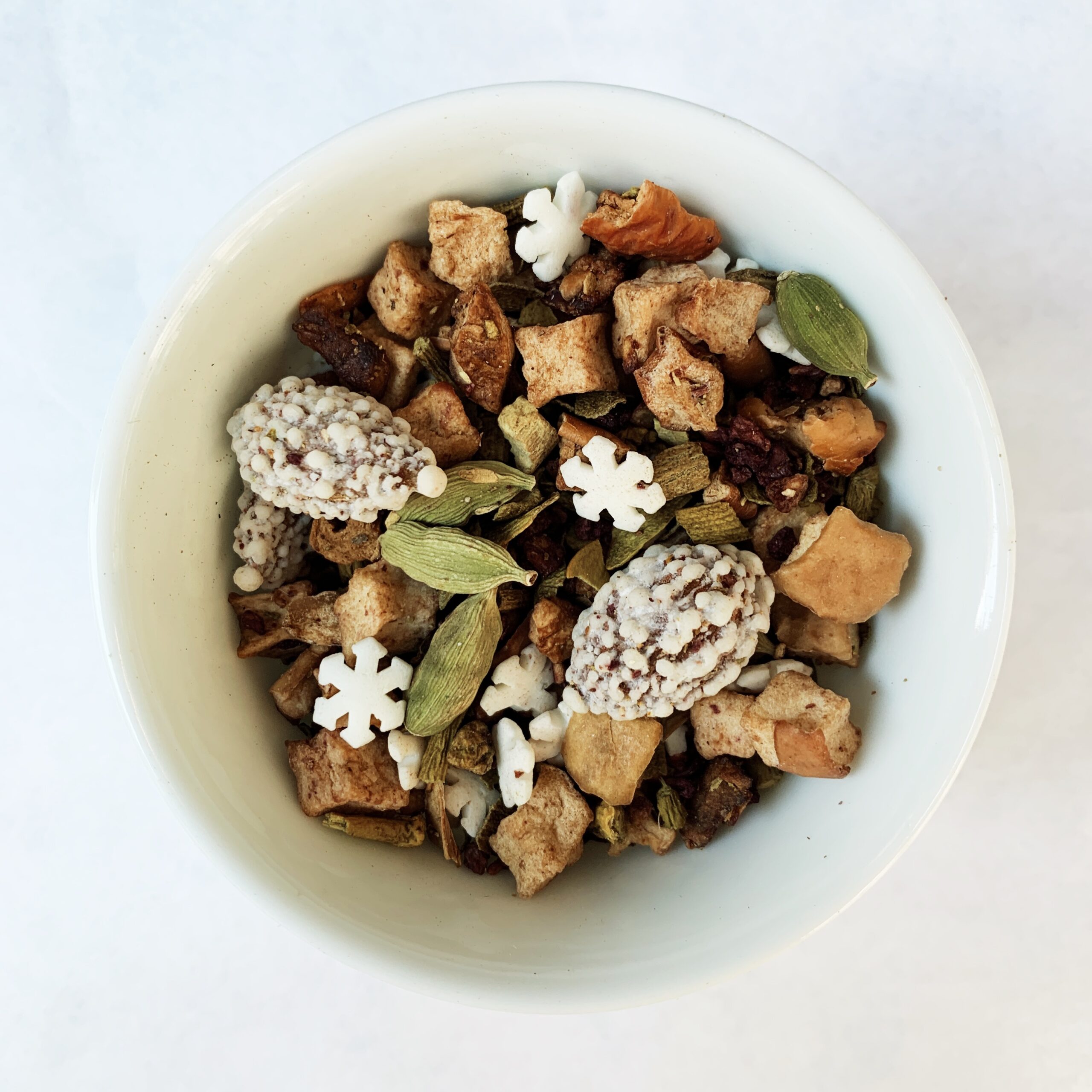4. Lady Snow di The Tea ovvero una miscela di cubetti di mela, mandole zuccherate, pezzetti di mela, cristalli di zucchero a stella, vischio, pezzetti di lamponi liofilizzati, aroma, cardamomo intero