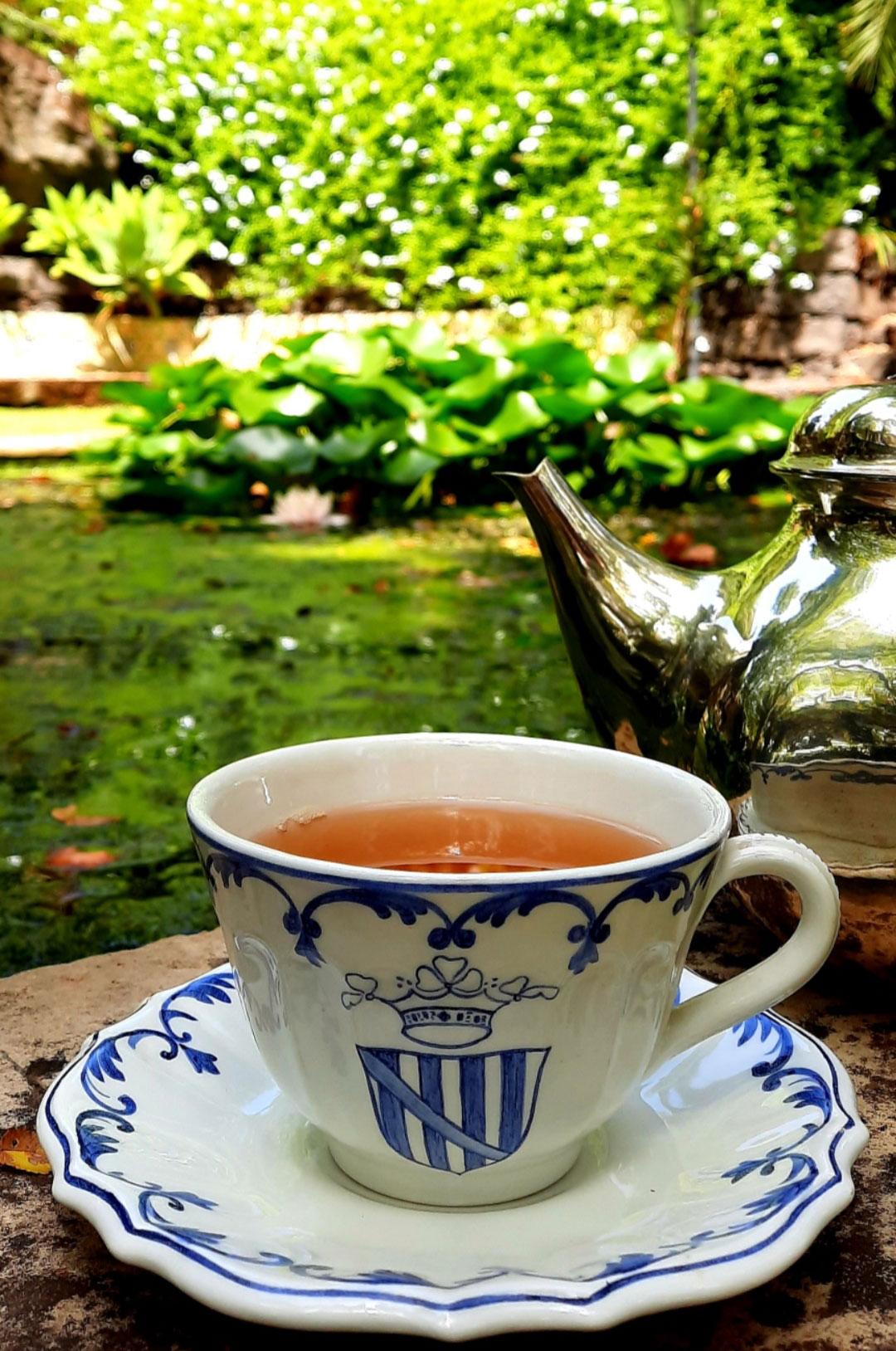 In questo paradiso esotico e insieme mediterraneo dall’aria nobiliare, il tè si sorseggia romanticamente sul bordo dello stagno sbirciando lo sbocciare delle folgoranti ninfee, lungo la saia (antico sistema idrico in terracotta per il deflusso delle acque), ascoltando l’acqua che scorre a mo’ di cascata, sui divani maiolicati, nella serra con le piante aromatiche coltivate utilizzando la tecnica acquaponica con la vasca coi pesci rossi.