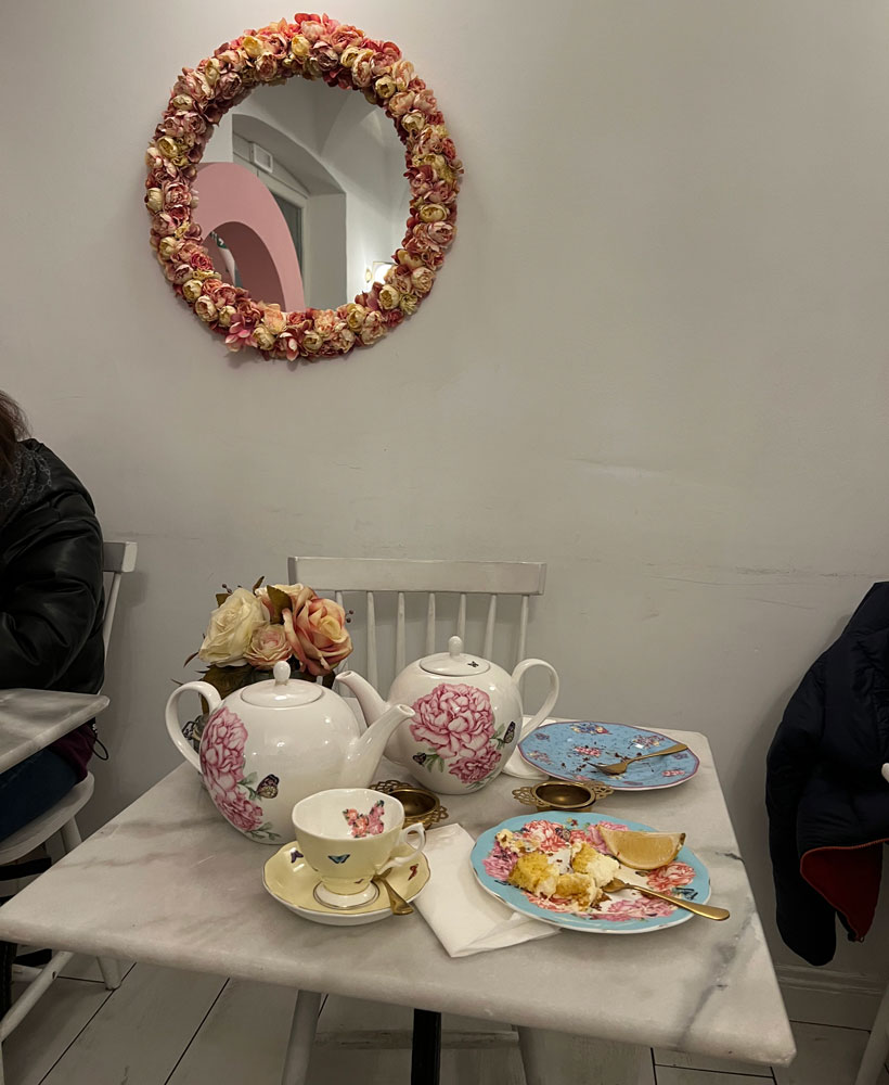 Una parete di rose, dov’è praticamente impossibile non scattarsi un selfie, caratterizza questa torteria e sala da tè dolce e vezzosa. Sembra di essere entrati nel paese delle meraviglie di Alice dove tutto è delicato e floreale: piatti, teiere, specchi… Ogni cosa qui è rosa o coperta di rose!