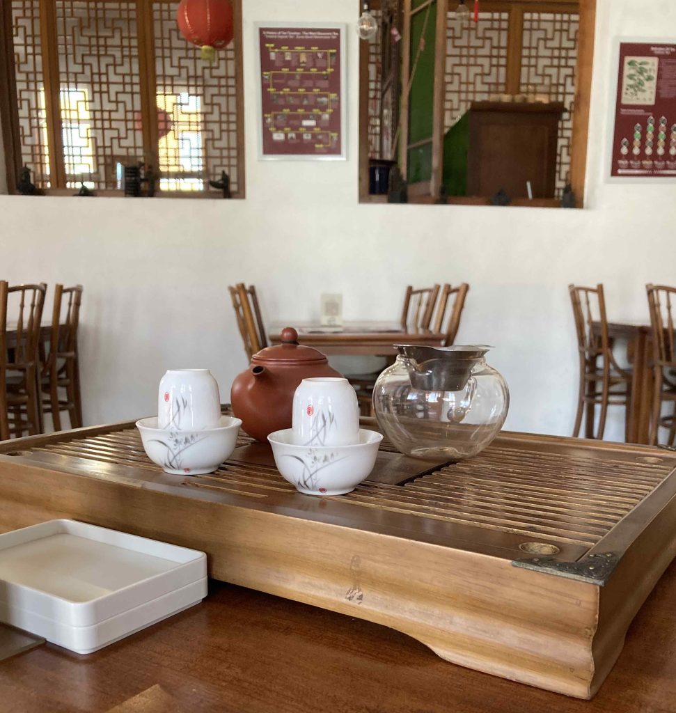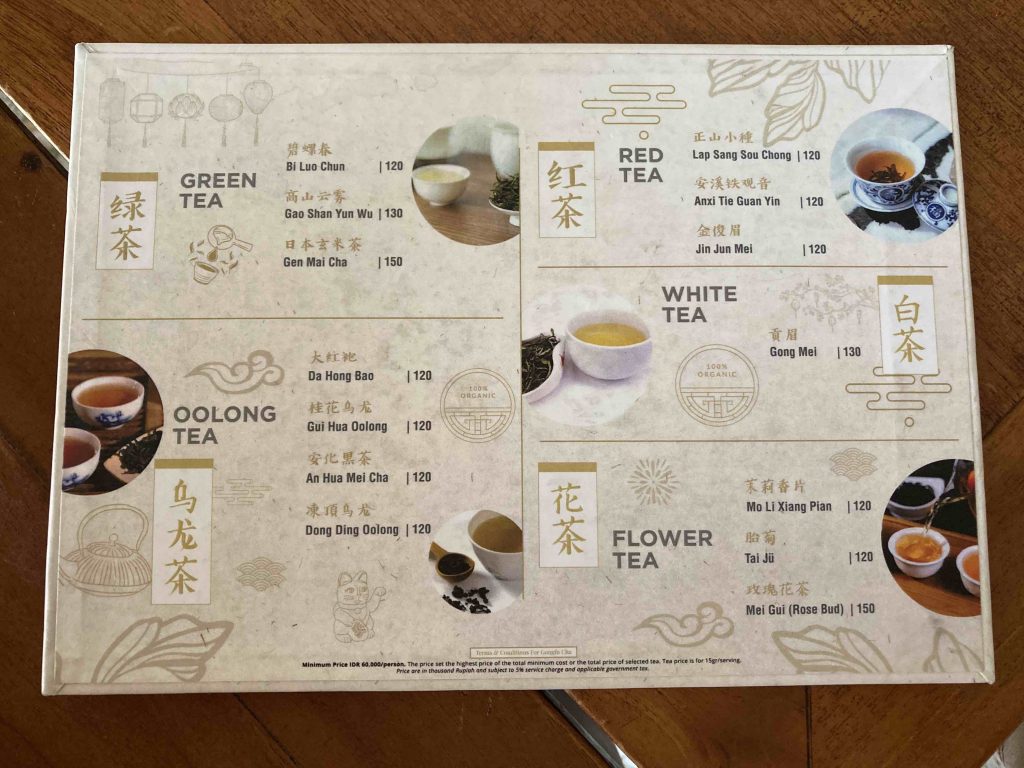 L’arredamento è costituito da antichi mobili cinesi e tavoli di legno più moderni. Le finestre sono schermate internamente da grate di legno che regalano un’atmosfera appartata e mitigano il rumore del traffico. Lampade di modernariato e vecchie fotografie alle pareti. L’ambiente e la pace di quello spazio consacrato al tè mi aveva conquistato, arrivando dalla caotica Giacarta e ho subito deciso di fermarmi al piano superiore e provare una degustazione. Su ciascun tavolo è già predisposto il servizio da tè cinese.
